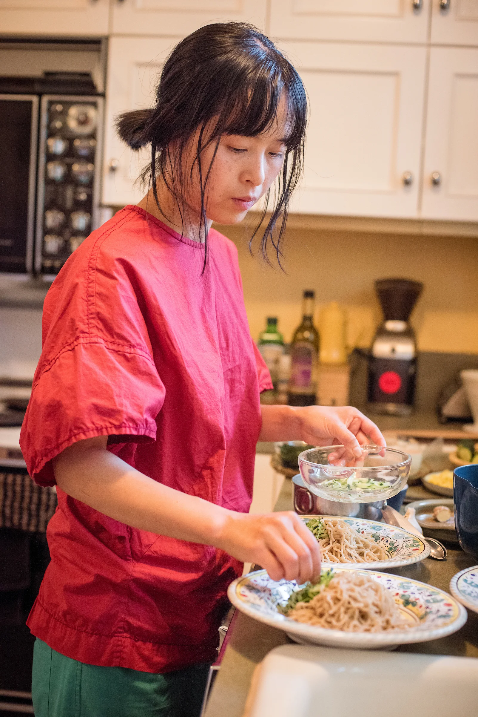 “Hiyashi Chuka (cold ramen noodles in a sesame dressing) is pretty common in Japan in the summer. Yet it is hard to find in the U.S., so I made up my own recipe! I thought the texture of the Umi Organic noodles would go well with the thick and nutty sauce.”
