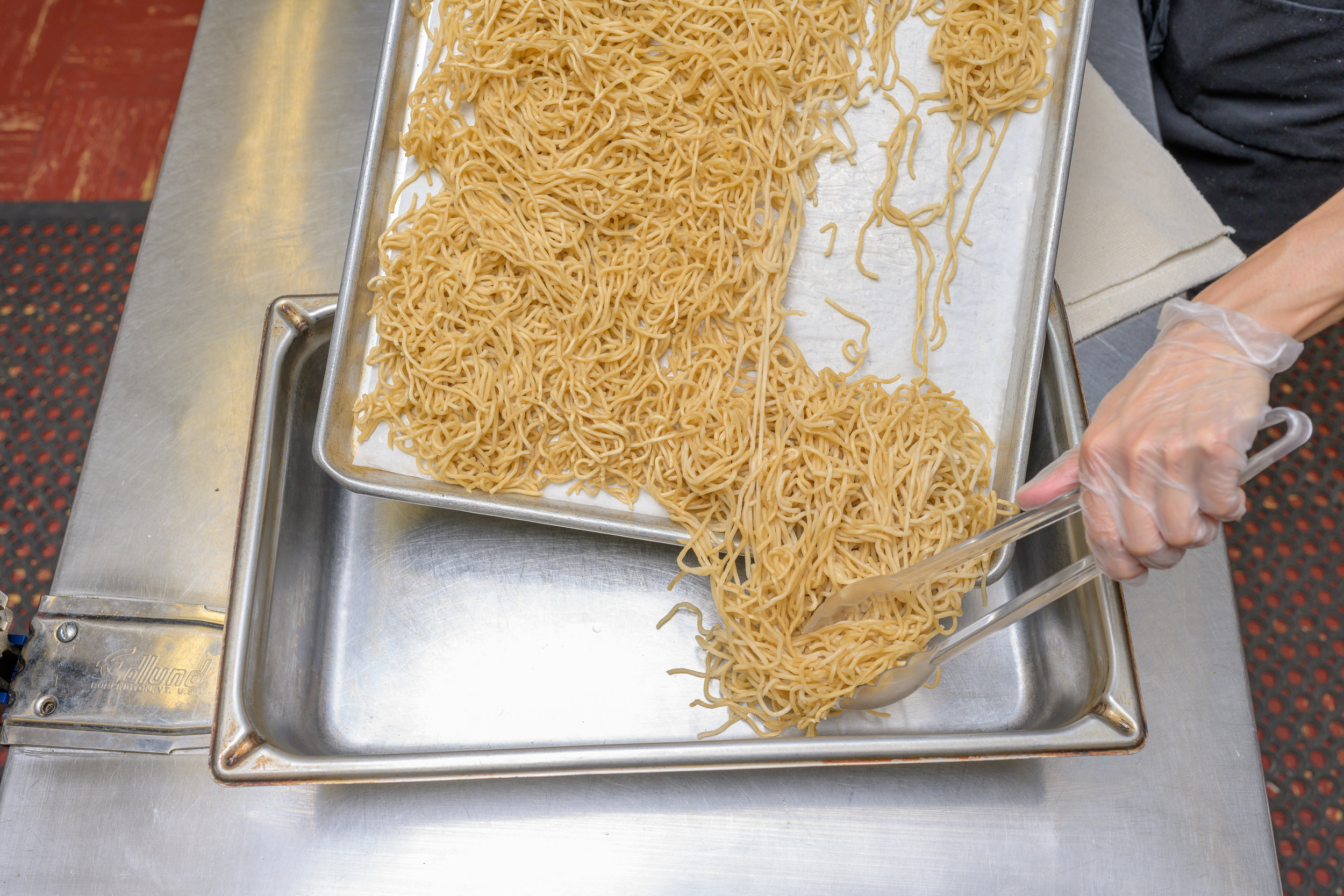 We boil, chill, and then toss our noodles with oil before packing them. That means you only have to reheat them, which can be done on a stove top or in an oven. Here is a basic recipe we developed for schools for cooking our noodles in an oven.
